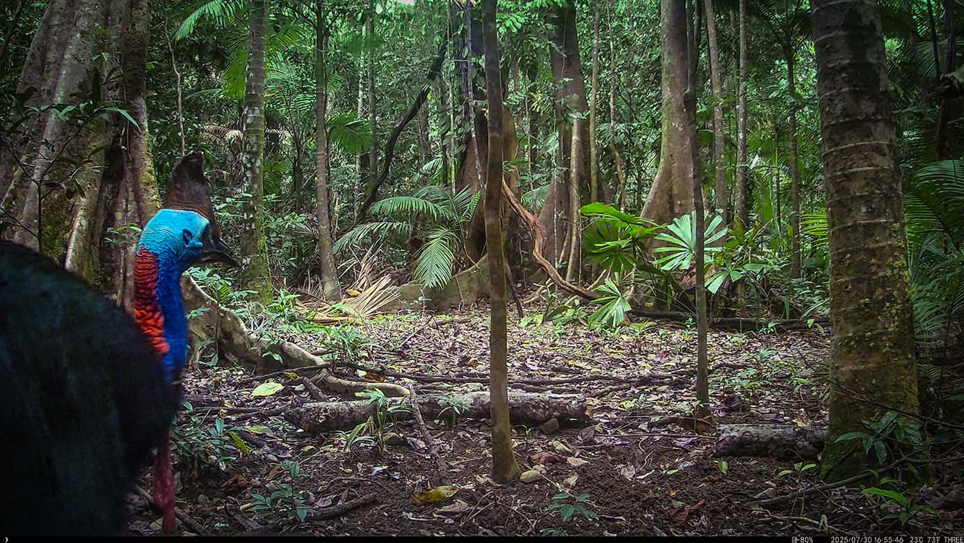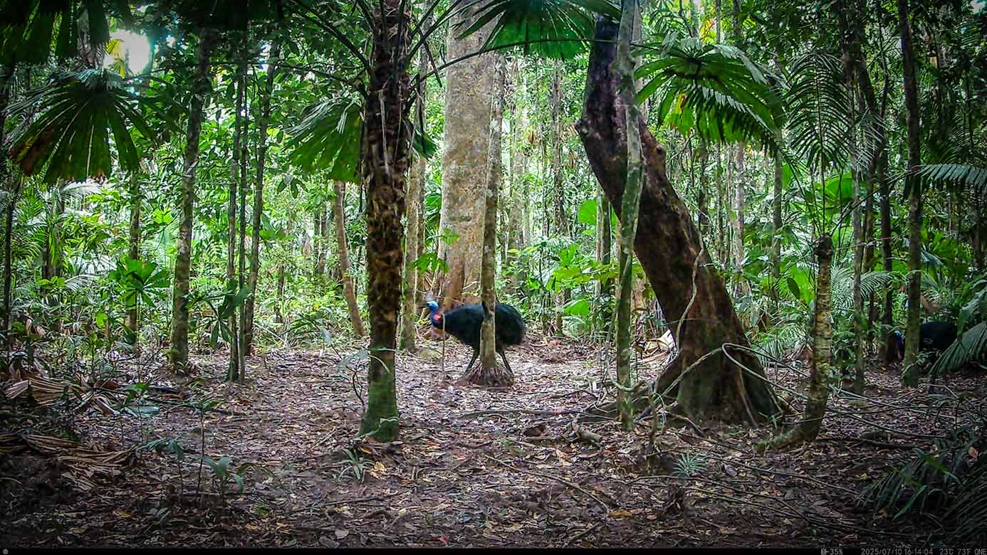 Camera Traps – July 2025 accrued 48-cassowary sightings, 39-dingoes and 81-feral pigs. Against the cumulative monthly average, cassowary numbers fell by 53%, dingoes diminished by 4% and feral-pigs dropped by 64%. Against July 2024, cassowaries dropped by 56%, dingoes also fell by 37% and feral-pigs plummeted by 94%.